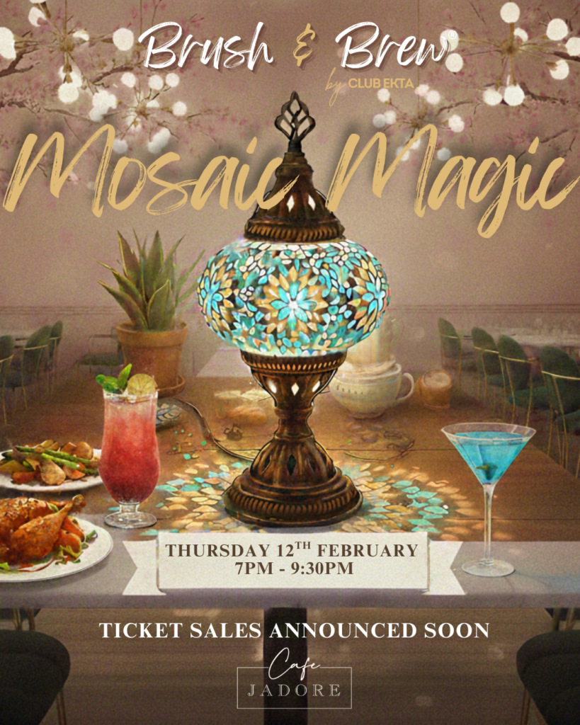 Join us for an enchanting evening of creativity, connection and calm at Mosaic Magic, a hands-on mosaic lamp-making experience hosted by Brush & Brew®. Partnered with curated food and drinks at Cafe J’adore